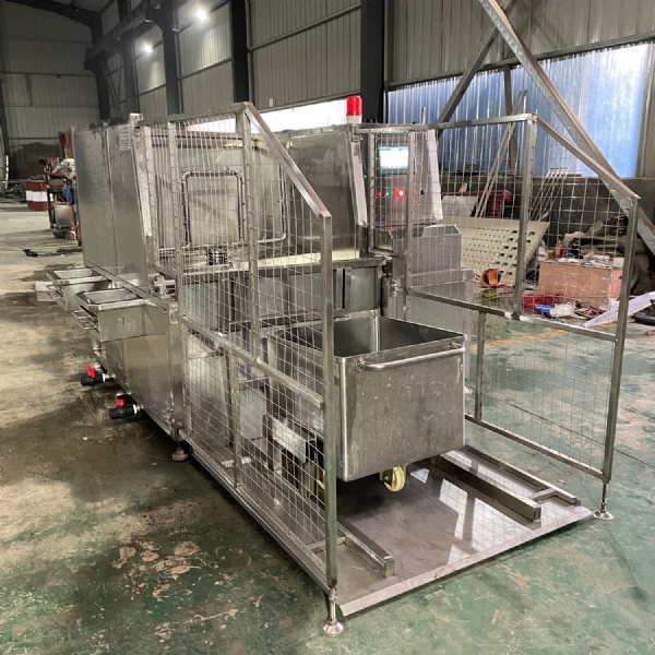 該設(shè)備包含清洗和漂洗腔,以及上料和卸料設(shè)備。清洗用的水過濾后再循環(huán)使用。漂洗用的水量可進行調(diào)節(jié),達到滿意的節(jié)水效果。電子清洗劑劑量系統(tǒng)可在清洗過程中控制清洗劑添加的過程。結(jié)構(gòu)緊湊,帶安全護軌,光電系統(tǒng)使得操作人員在操作時的安全性得到保障。帶轉(zhuǎn)臂,臂上帶清洗噴嘴,所有肉車的表面都得到非常細致的清洗效果。結(jié)構(gòu):不銹鋼結(jié)構(gòu)、不銹鋼清洗泵、水加熱系統(tǒng): 蒸汽、帶清洗轉(zhuǎn)臂清洗過程中多重保護、帶上料和卸料系統(tǒng)、封閉的水循環(huán)系統(tǒng),帶過濾系統(tǒng)。在每個單獨的操作中,清洗過程都可調(diào)整和控制。